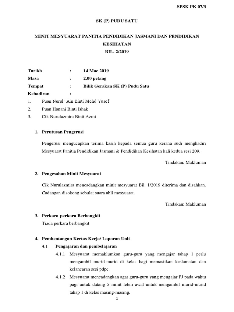 Doc Contoh Minit Mesyuarat Panitia Pendidikan Jasmani Kali Izzat Idris Academia Edu