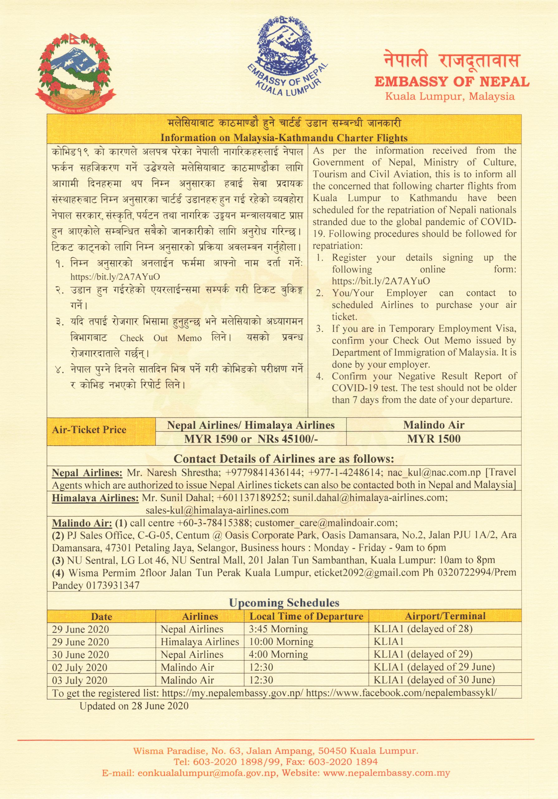 Embassy Of Nepal Kuala Lumpur Malaysia Published The Schedule Of Upcoming Charter Flights From Malaysia To Nepal न प ल द त व स मल श य ल मल स य ब ट न प लक ल ग आग म च र टरक त ल क
