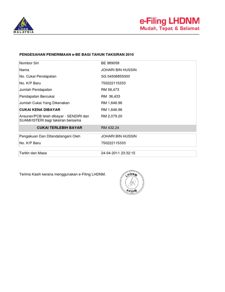 Pengesahan Penerimaan E Be Bagi Tahun Taksiran 2010