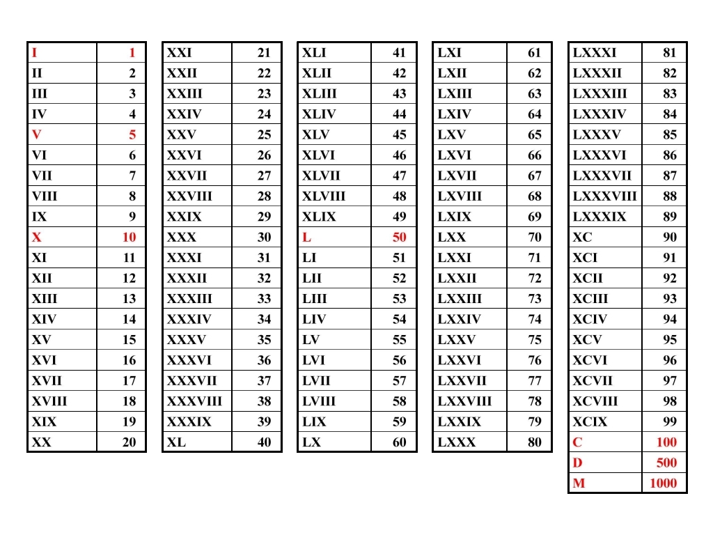 Roman Numbers Chart 1 100
